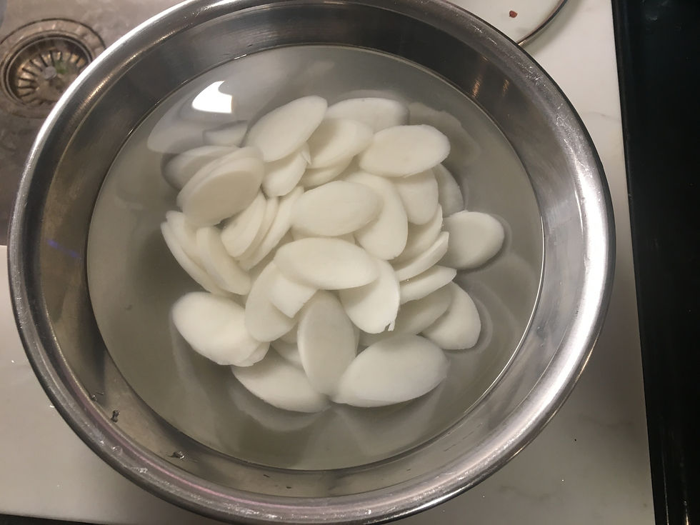 1. Put the rice cakes into a bowl of water and let them rest in water for 10mins