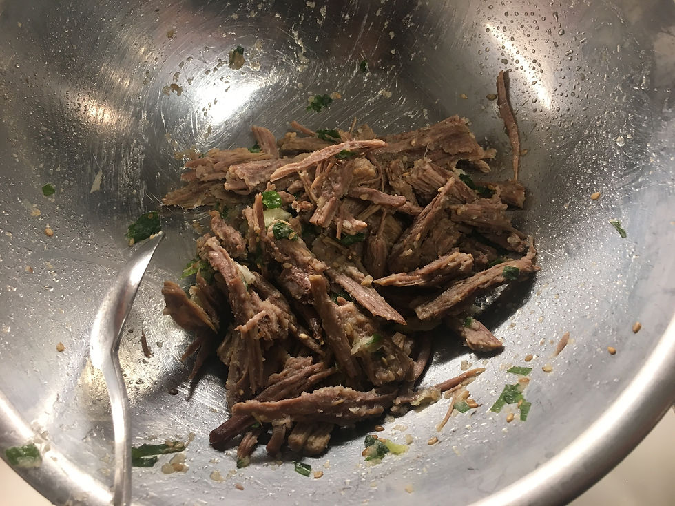 3. Rip the brisket into small pieces and season with sesame oil, sesame seed, soy sauce and a bit of spring onion. Mix it all together.